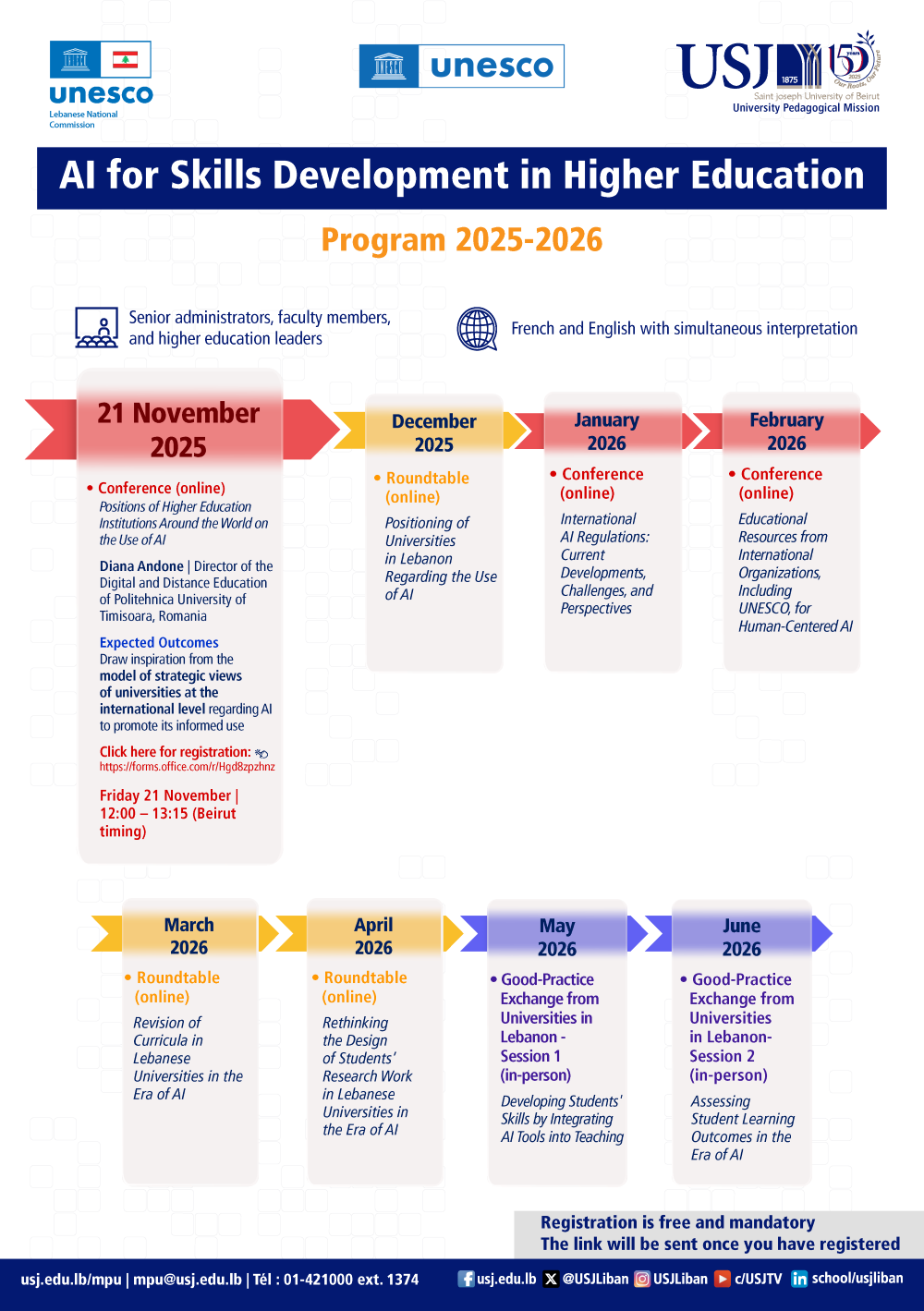The Lebanese National Commission for UNESCO, in partnership with USJ’s University Pedagogical Mission, and with the support of the UNESCO Regional Office in Beirut, are launching a program on “AI for Skills Development in Higher Education”. The program includes lectures, roundtables, and good-practice exchange sessions.